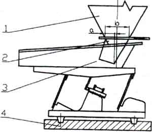 ??電磁振動給料機的振幅和給料量受料倉倉壓影響較大,設計料倉時應盡量減少倉壓,使溜咀后側板承受一定的倉壓,并設置斜溜沮及下料閘門。如圖,一般a=1/4b。溜咀四周應與給料槽留有一定的間隙,一般5~10mm,以免產生噪音及影響振動。